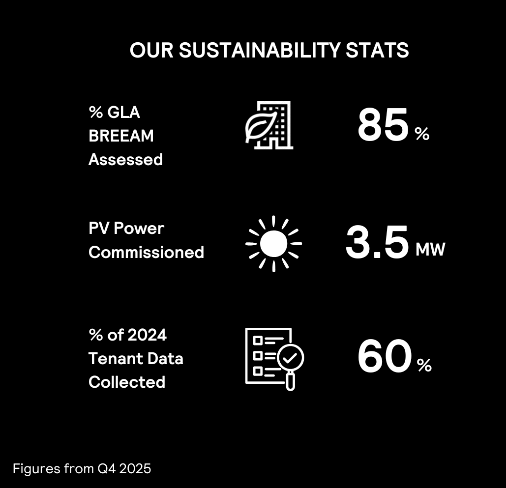 - Sustainable Design and Certification, targeting a minimum BREEAM “Very Good” rating for standing assets and “Excellent” for major refurbishments.